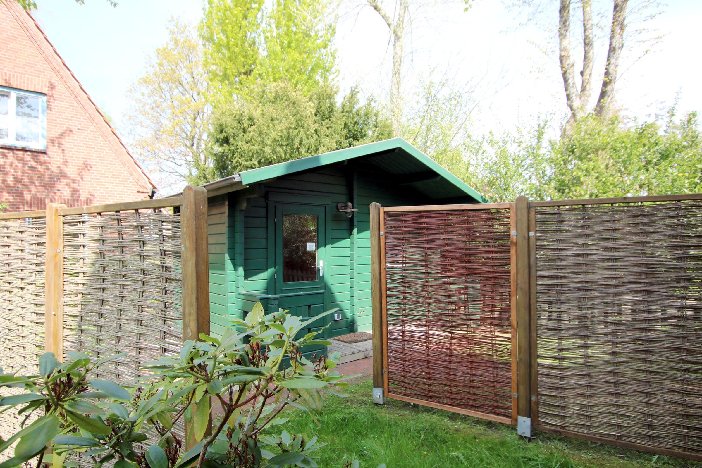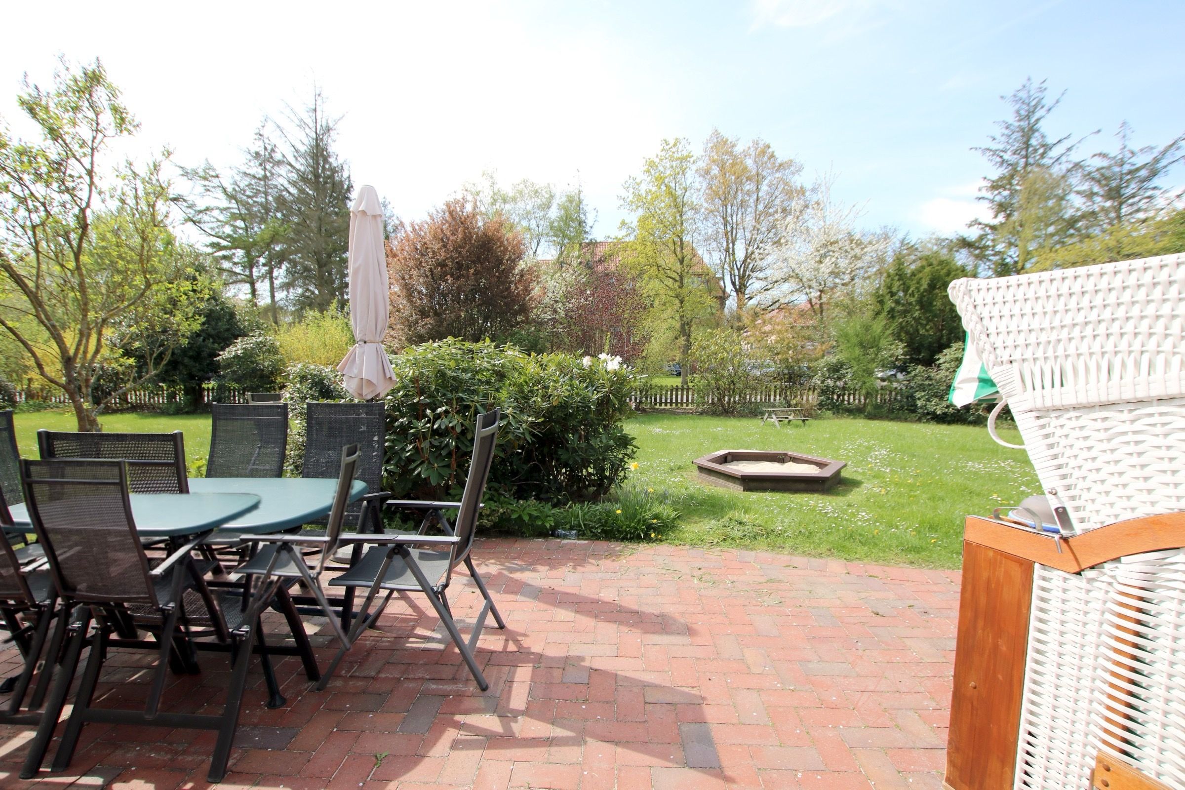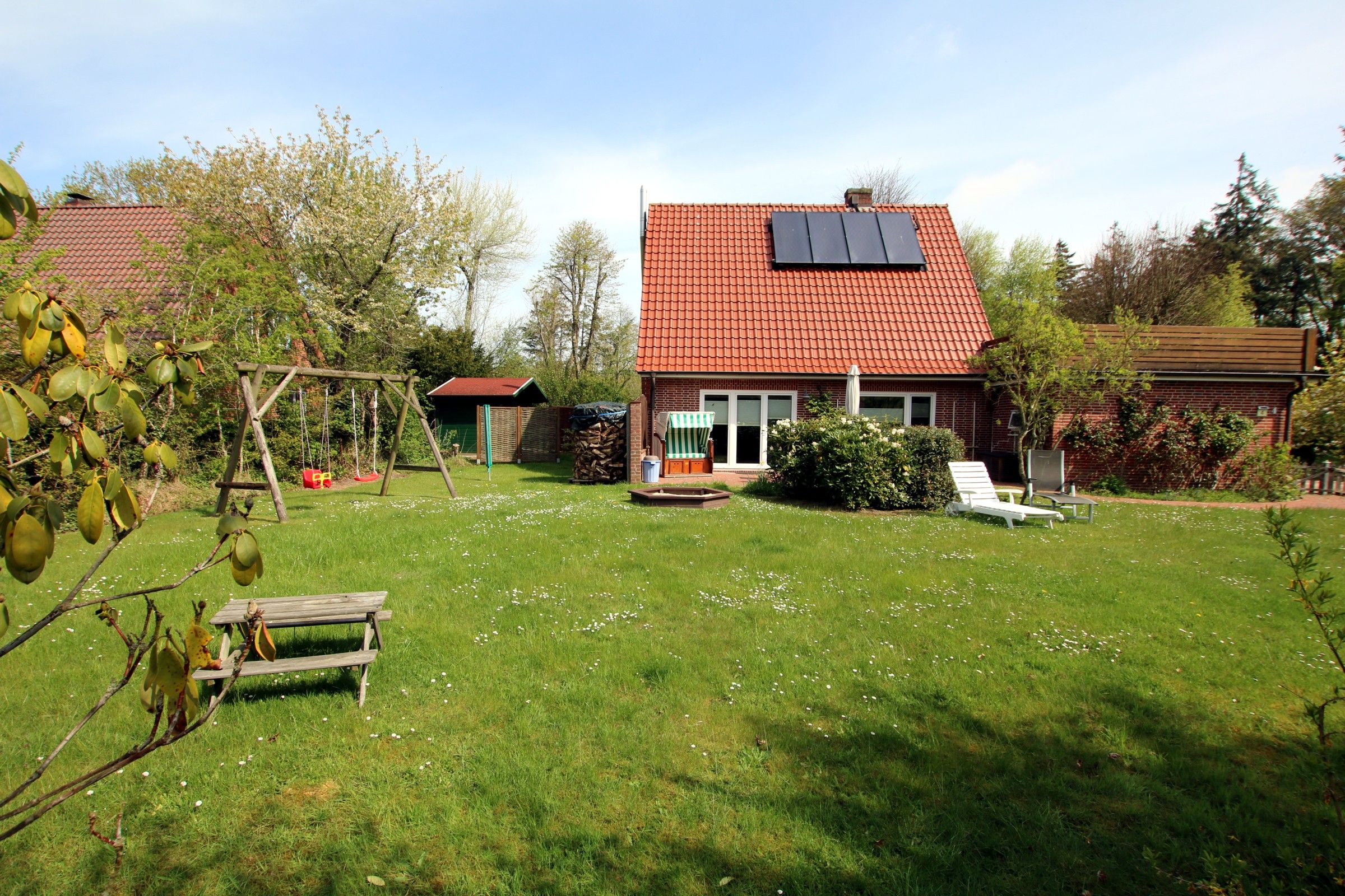 Schaukel, Sandkiste, Buggy, Bollerwagen und auch ein Strandkorb sind vorhanden. Abschließbare Garage als Fahrradabstellmöglichkeit. Südterrasse mit Strandkorb, zwei Rollliegen, Sonnenschirm,